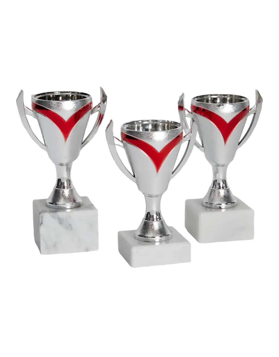 Budgetpokal i rubinröd färg, vit marmorsockel.