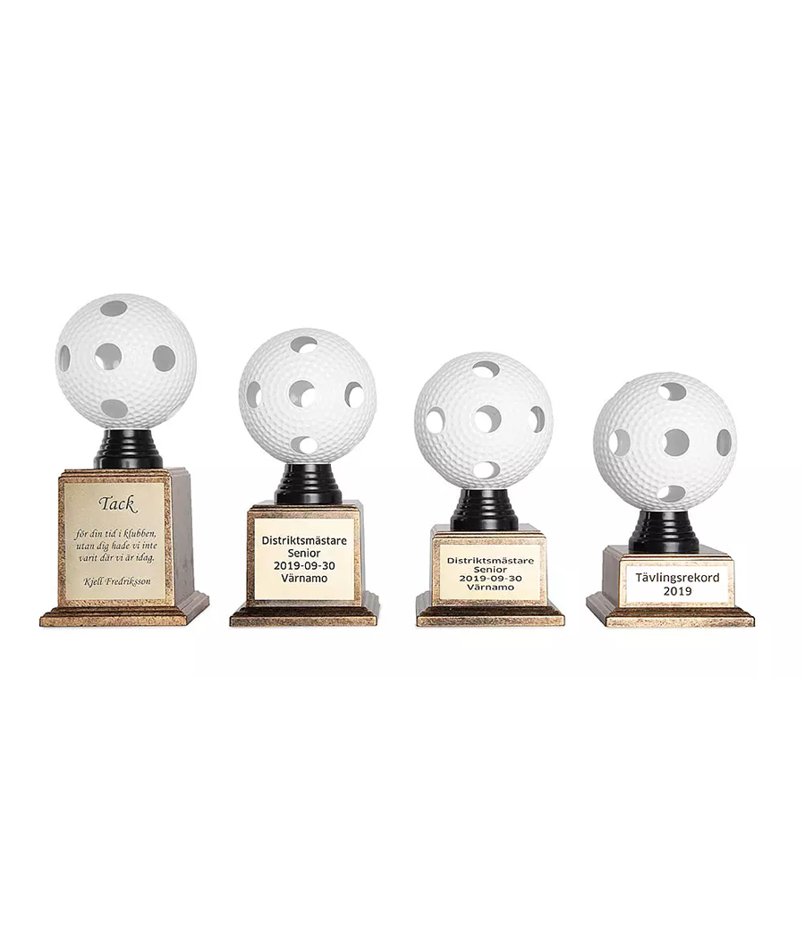 Innebandyboll monterad på sockel i antikt guld
